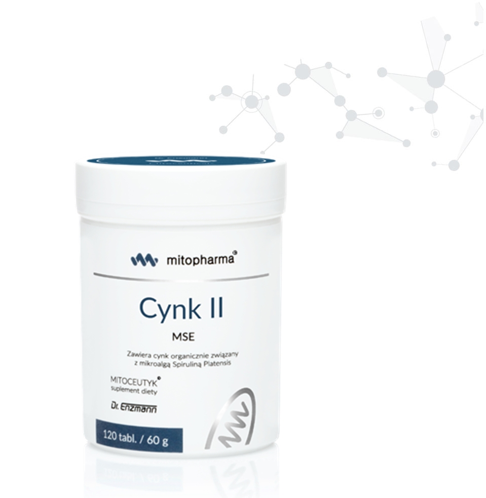 Cynk II MSE zawiera wysoce przyswajalną formę cynku dwuwartościowego, organicznie związanego z mikroalgą spiruliną platensis. Umożliwia utrzymanie prawidłowego poziomu cynku w komórkach.