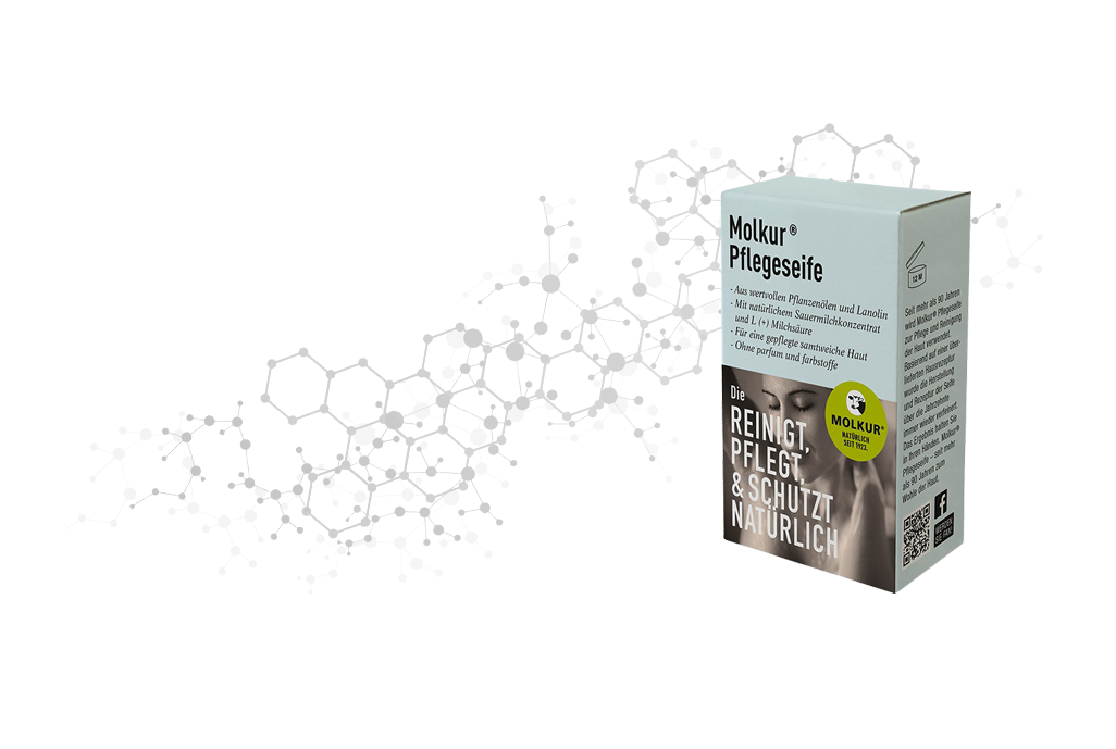 Specjalny koncentrat kwaśnej serwatki, oprócz kwasu mlekowego, zawiera sole mineralne i pierwiastki śladowe, które są ważne dla funkcjonowania zdrowej skóry. Codzienne czyszczenie mydłem pielęgnacyjnym Molkur® utrzymuje kwaśny płaszcz skóry w nienaruszonym stanie i dostarcza jej niezbędnych składników odżywczych. Wzmacnia w ten sposób florę skóry i czyni ją bardziej odporną na wpływy środowiska i bodźce zewnętrzne.