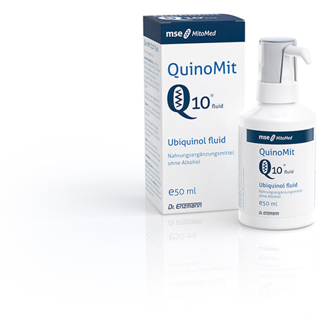 QuinoMit Q10® fluid zawiera aktywną formę koenzymu Q10 - ubichinol, w formie ultramałych cząsteczek. Umożliwia wsparcie utrzymania prawidłowego poziomu koenzymu Q10 w komórkach.