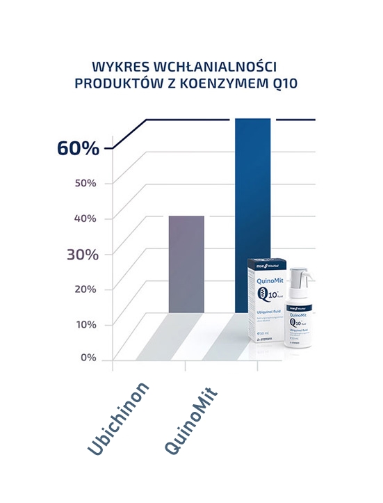 - Dzięki wykorzystaniu najnowocześniejszej technologii w procesie produkcji zawarty w QuinoMit Q10® fluid koenzym Q10 wyróżnia się niespotykaną dotychczas wśród innych tego typu produktów biodostępnością koenzymu Q10 na poziomie aż 60%.