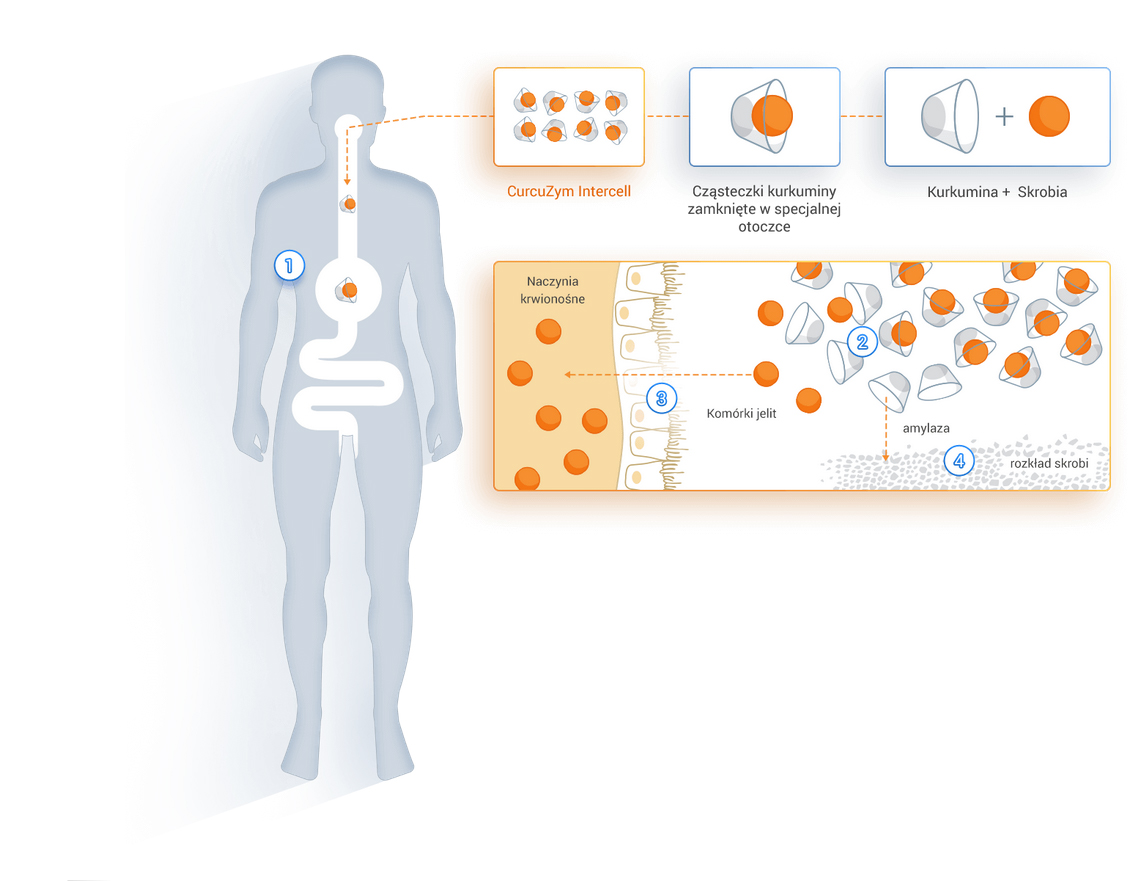 - Każda cząsteczka kurkumy została zamknięta w skrobiowej otoczce, dzięki której w nienaruszonej formie przedostaje się aż do jelita cienkiego. W jelicie cienkim z kapsułki uwalniane są pojedynczo cząsteczki kurkumy, które zostają wchłonięte bezpośrednio przez komórki błony śluzowej jelit oraz rozprowadzone po całym organizmie, co w znaczący sposób zwiększa dostępność biologiczną substancji czynnej. Następnie skrobiowa otoczka ulega rozłożeniu przy pomocy enzymów.