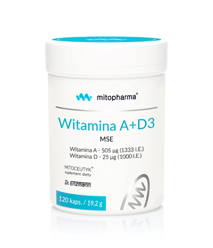 - Witaminy A oraz D działają synergicznie w połączeniu z cynkiem, dlatego preparat Cynk® mse lub CynkoMit stanowią doskonałe uzupełnienie preparatu witamina A+D3 mse.