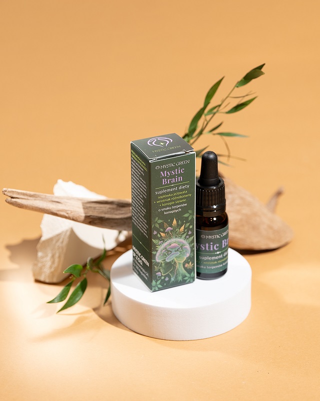 Mystic Brain zawiera olejek konopny połączony z ekstraktami z owocników soplówki jeżowatej i wrośniaka różnobarwnego.