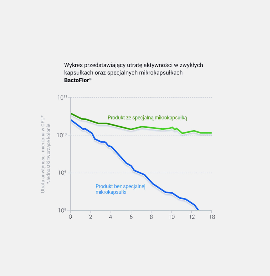 Stabilność przechowywania bakterii jelitowych, wrażliwych na tlen i parę wodną, zapewnia dodatkowo dobór optymalnych materiałów opakowaniowych. Wszystkie kapsułki z kulturami bakterii pakowane są w zastrzeżone opakowania blistrowe, które wyróżniają się najwyższą barierą dla szkodliwego tlenu lub pary wodnej.
