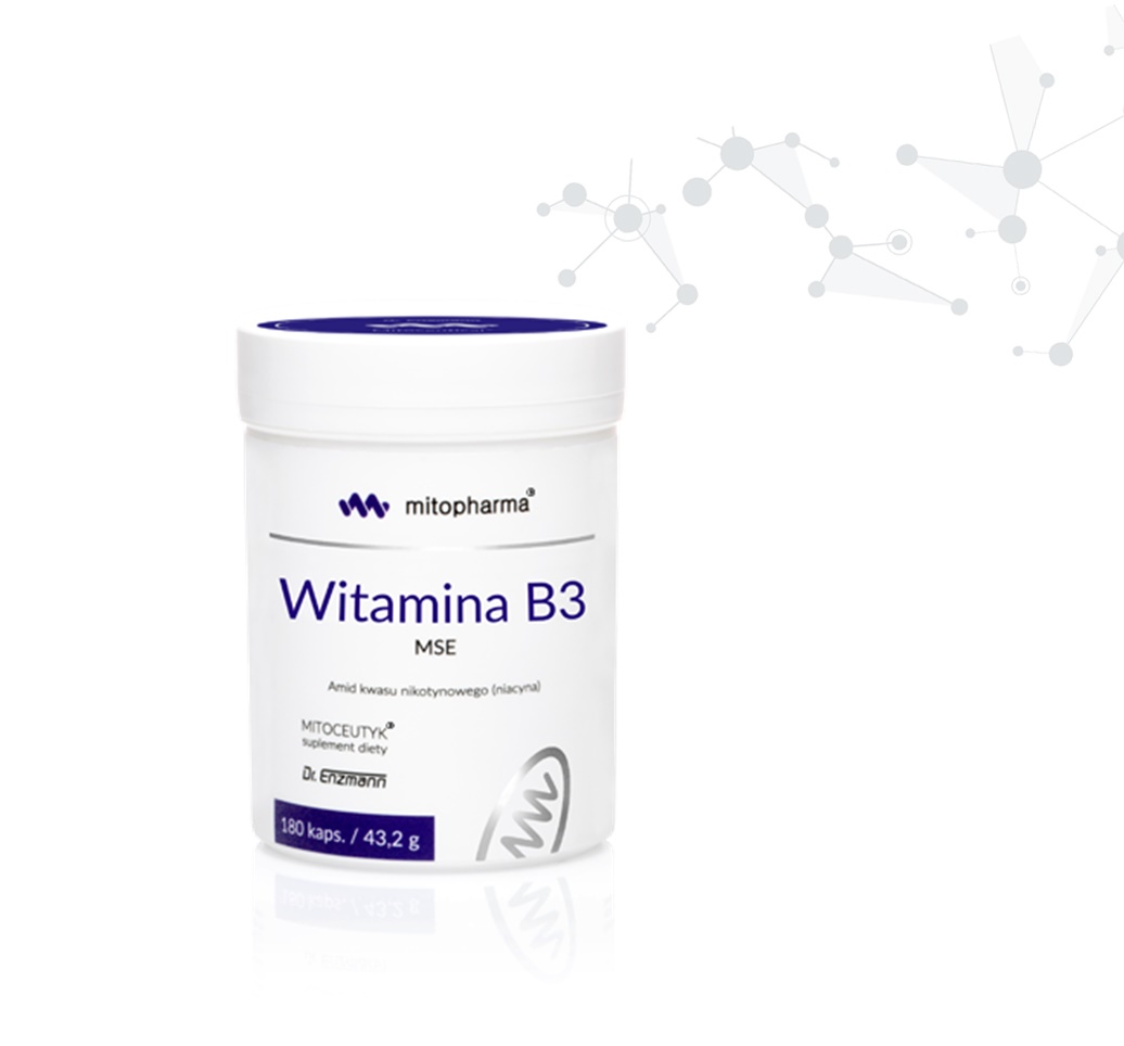 Witamina B3 MSE zawiera formę amidu kwasu nikotynowego. Umożliwia utrzymywanie prawidłowego poziomu witaminy B3 w komórkach.