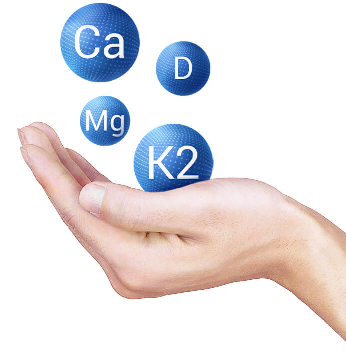 sole wapniowe kwasu cytrynowego (wapń), sole magnezowe kwasu cytrynowego (magnez), tlenek magnezu (magnez), substancja glazurująca: hydroksypropylometyloceluloza, substancja wypełniająca: celuloza mikrokrystaliczna, menachinon-7 (witamina K), cholekalcyferol (witamina D), hydroksykobalamina (witamina B12), kwas pteroilomonoglutaminowy (kwas foliowy), substancja przeciwzbrylająca: sole magnezowe kwasów tłuszczowych.